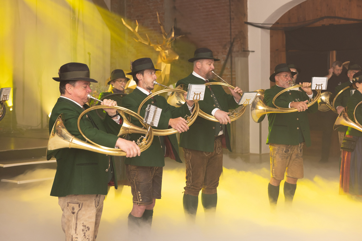 Schon beim Einlass wurden die Gäste mit festlichen Hornklängen begrüßt, bevor wir feierlich die offizielle Eröffnung des Balls gestalten durften. Die hervorragende Akustik der Seifenfabrik unterstrich die jagdlichen Signale und verlieh dem Empfang den passenden festlichen Rahmen.